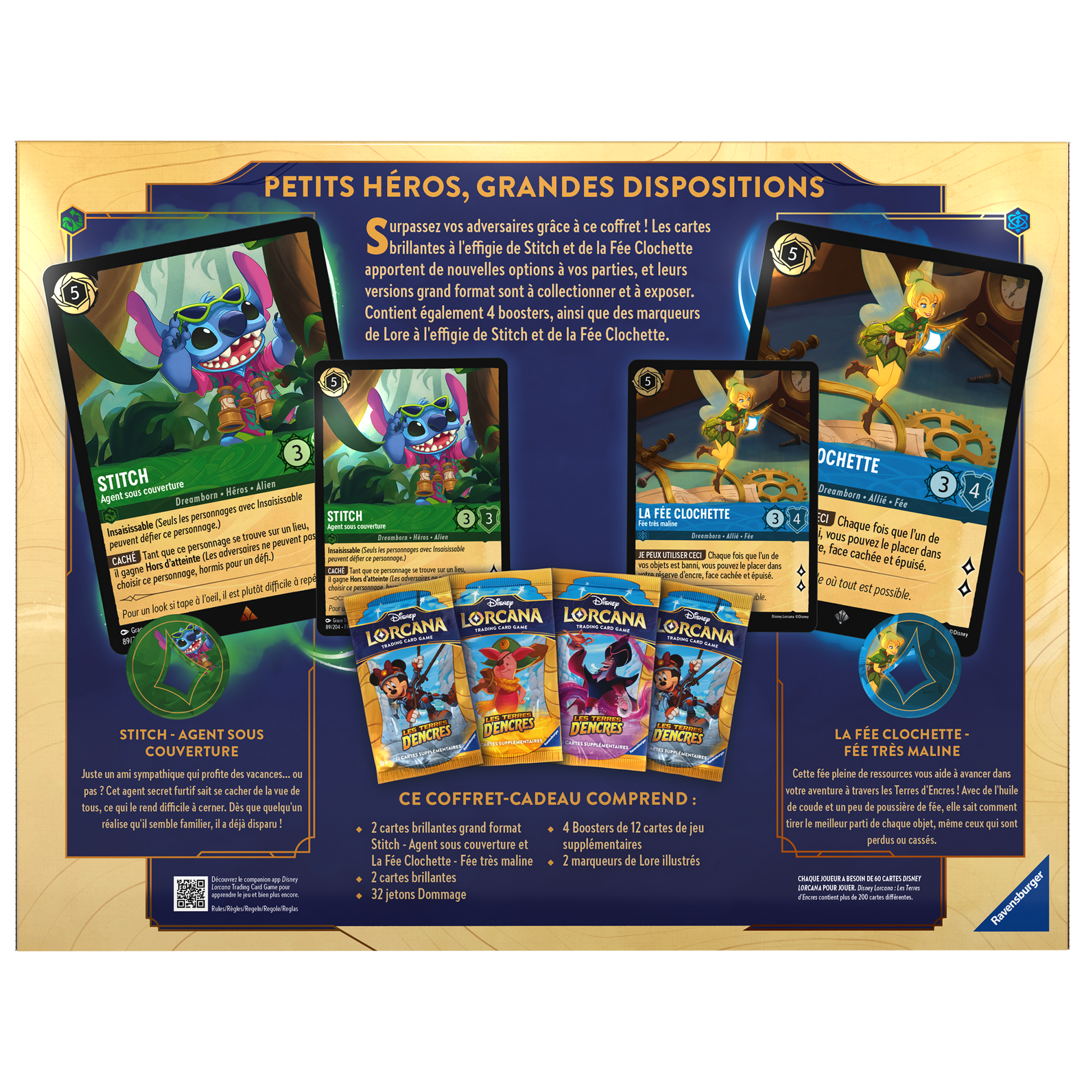 Les joueuses et joueurs peuvent (se) faire plaisir avec ce coffret cadeau ! Les cartes brillantes représentant Stitch - Agent sous couverture et La Fée Clochette - Fée très maline apportent de nouvelles options à vos decks, et les versions brillantes grand format sont amusantes à collectionner et à afficher. Le coffret cadeau est livré avec 4 boosters aléatoires de Les Terres d'Encres pour enrichir rapidement votre collection et ajouter de la variété à vos decks.Chaque joueuse et joueur a besoin d'un deck Disney Lorcana TCG d'au moins 60 cartes pour jouer.